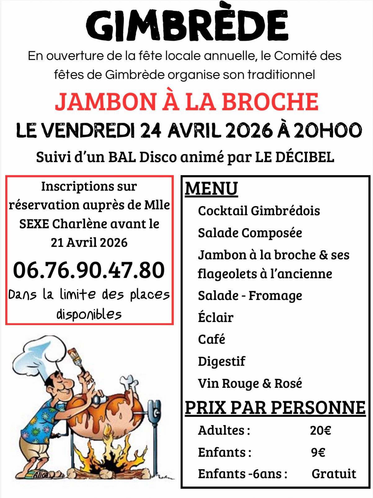 En ouverture de la fête locale annuelle, le Comité des fêtes de Gimbrède vous invite à son traditionnel jambon à la broche. Le menu comprend un cocktail Gimbrédois, une salade composée, le jambon à la broche avec ses flageolets à l'ancienne, une salade-fromage, un éclair, un café, un digestif, et du vin rouge & rosé. La soirée se poursuivra avec un bal disco animé par LE DÉCIBEL. Les inscriptions sont obligatoires auprès de Mlle SEXE Charlène avant le 21 avril 2026, dans la limite des places disponibles.