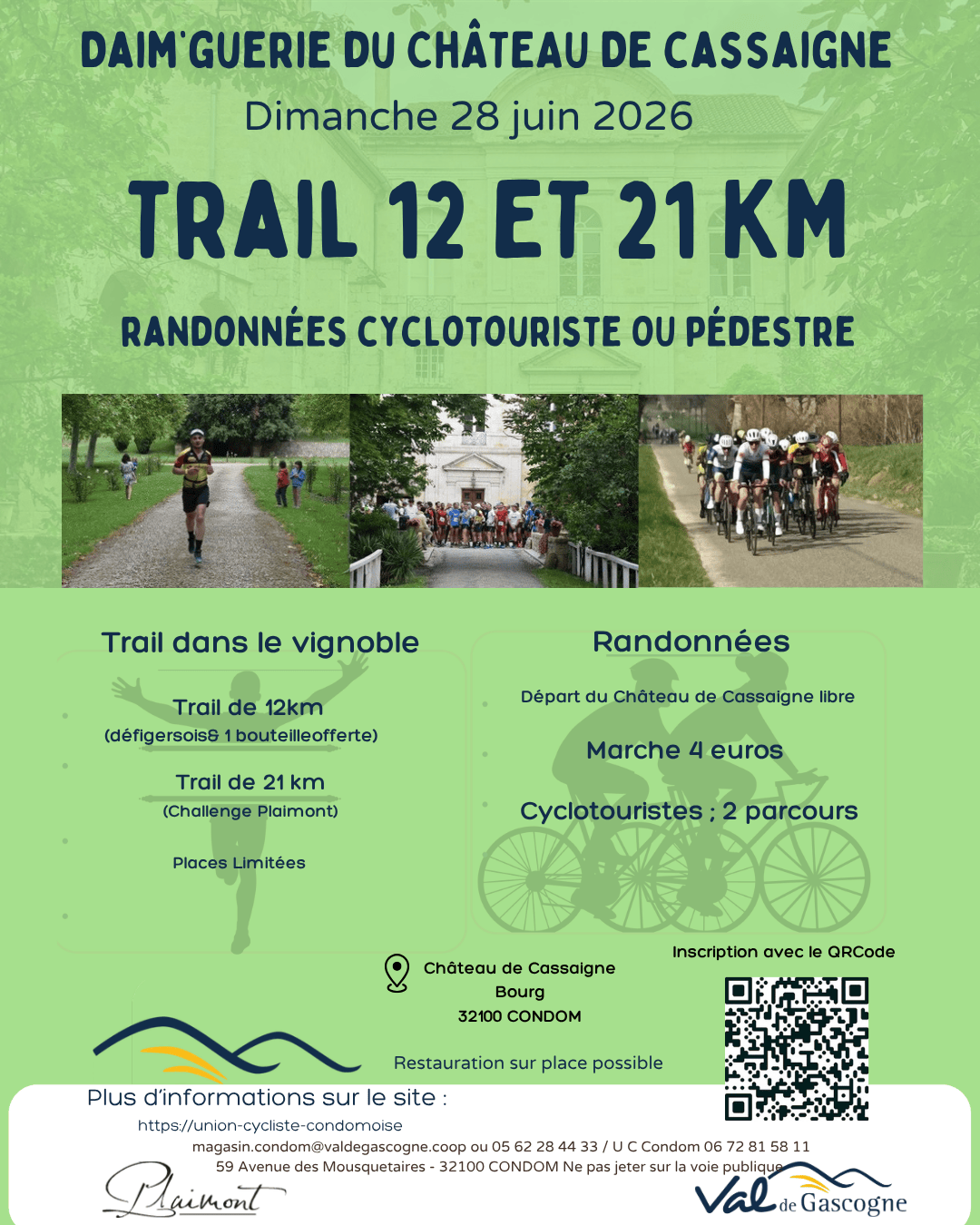 Un cadre d’exception : le Château de Cassaigne ! Ancienne résidence des évêques de Condom, le Château de Cassaigne offre un décor historique remarquable. Point de départ et d’arrivée du trail, il incarne l’âme de l’événement, entre tradition et convivialité.